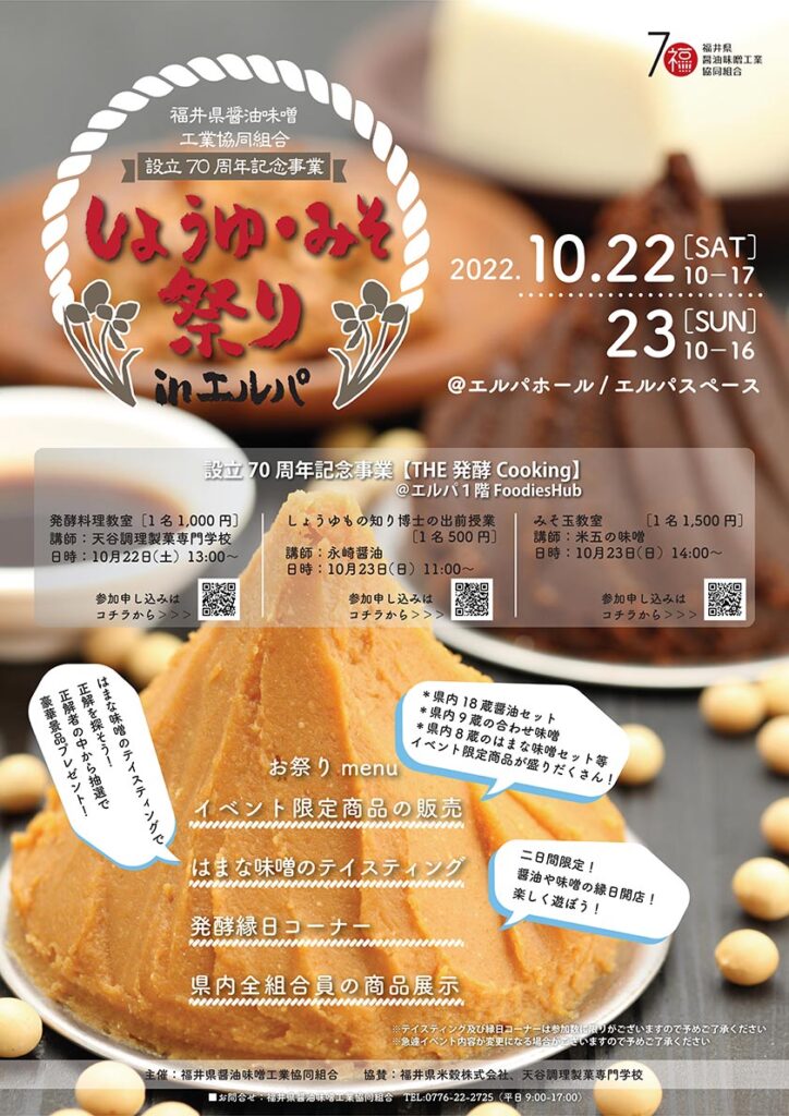 組合設立70周年を記念事業として、『しょうゆ・みそ祭り』を福井市最大のショッピングモール “ラブリーパートナーエルパ”にて開催いたします。